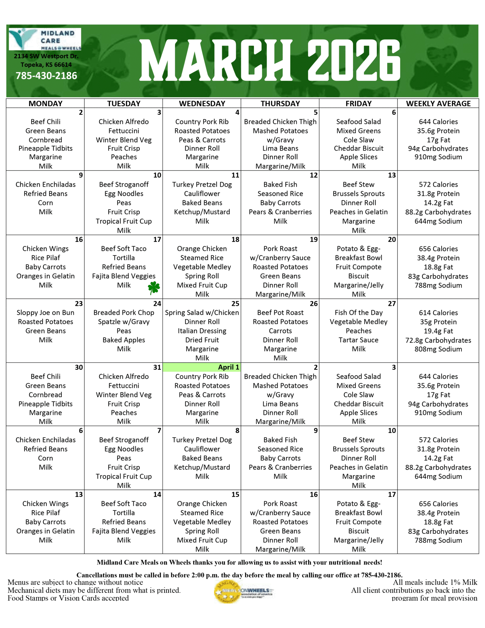 Meals on Wheels Menu